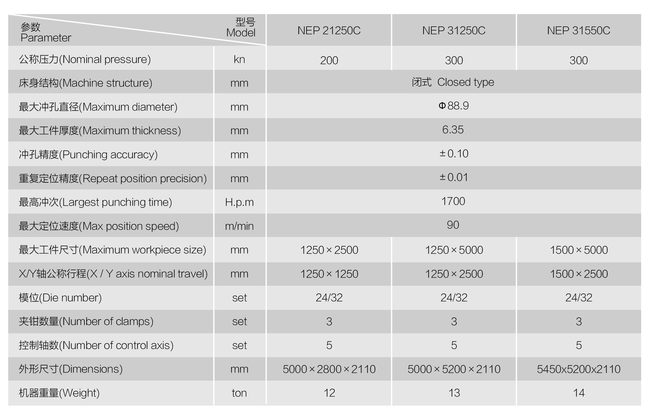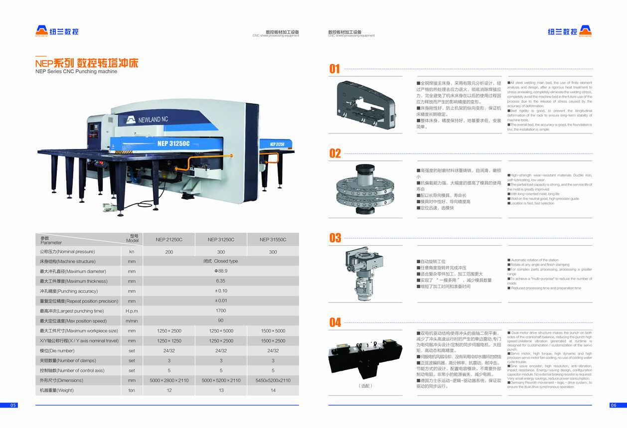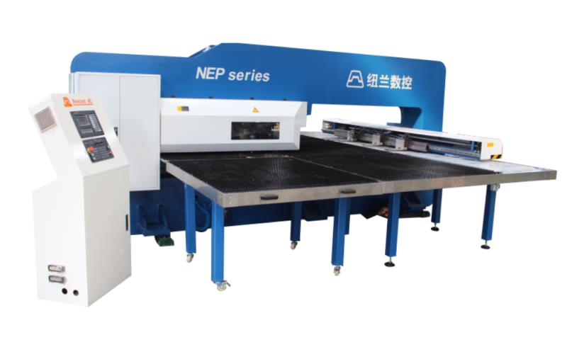 NEP系列全電伺服轉塔沖產(chǎn)品介紹 數控轉塔沖床是板材加工設備中最具生命力的產(chǎn)品,用于各類(lèi)金屬薄板零件加工,可以一次性自動(dòng)完成多種復雜孔型和淺拉深成型加工。通過(guò)自動(dòng)編程,可對板材進(jìn)行X,Y方向的精確定位,自動(dòng)選擇轉盤(pán)模具庫中的模具,按程序加工不同尺寸和孔距的孔,也可用小沖模以步?jīng)_方式加工尺寸較大的各種形狀的曲線(xiàn)輪廓,也可進(jìn)行特殊工藝加工,如百葉窗,淺拉伸,沉孔,翻邊孔,加強筋,壓印等。